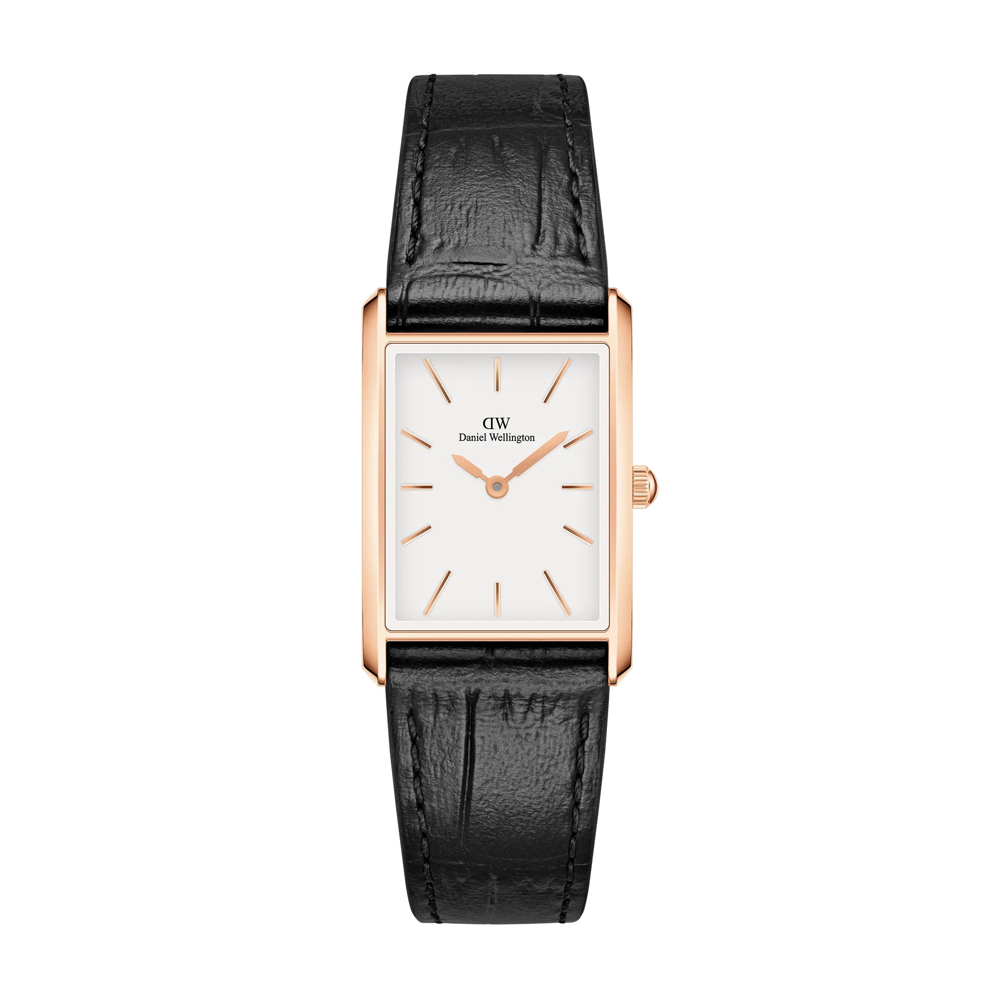 Con eleganti bordi geometrici e due misure tra cui scegliere, la nostra collezione Bound dona una perfetta simmetria al tuo polso. La cassa rettangolare curva di questo orologio in oro rosa si adatta perfettamente alla larghezza del cinturino in pelle nera con motivo coccodrillo, offrendoti un quadrante perfettamente integrato.