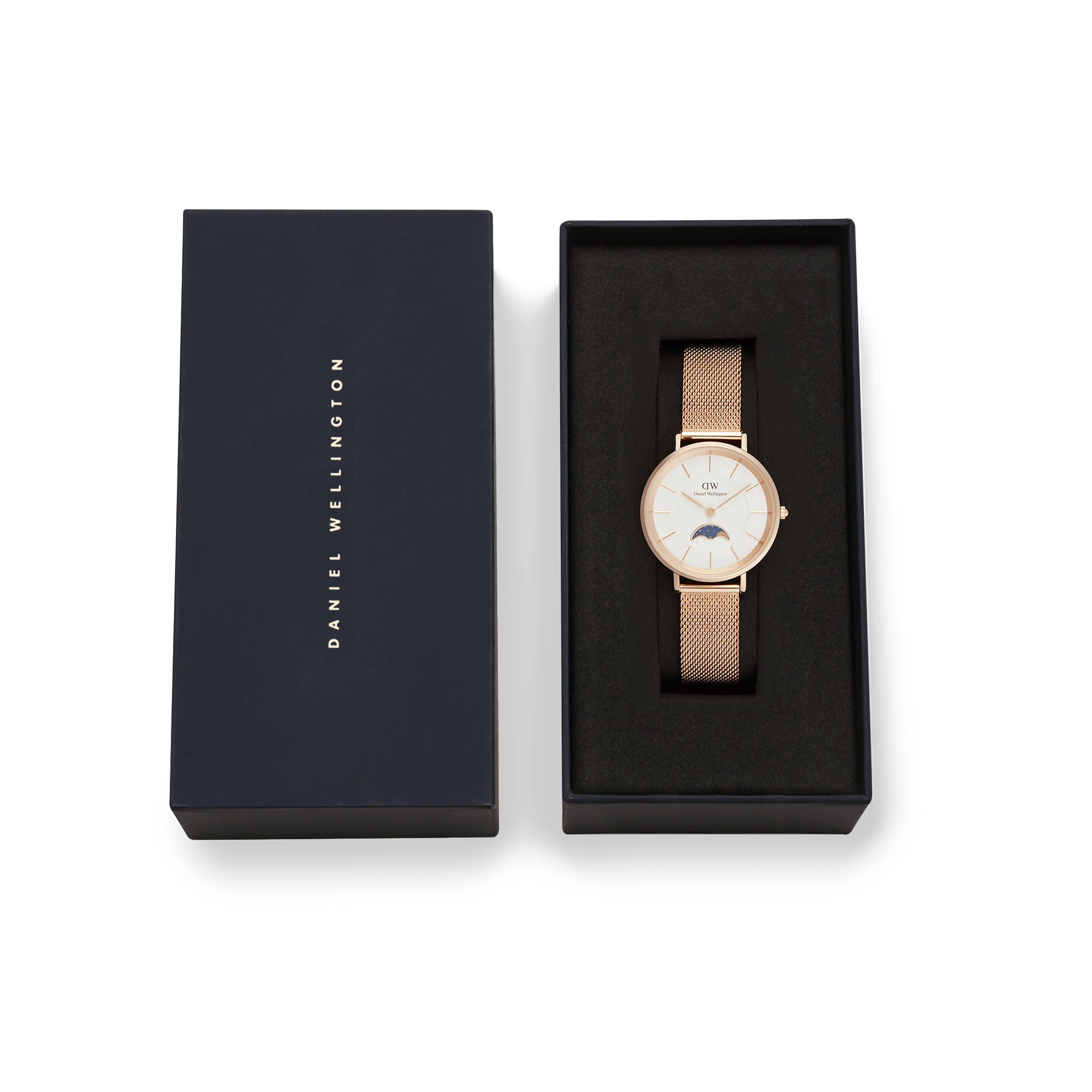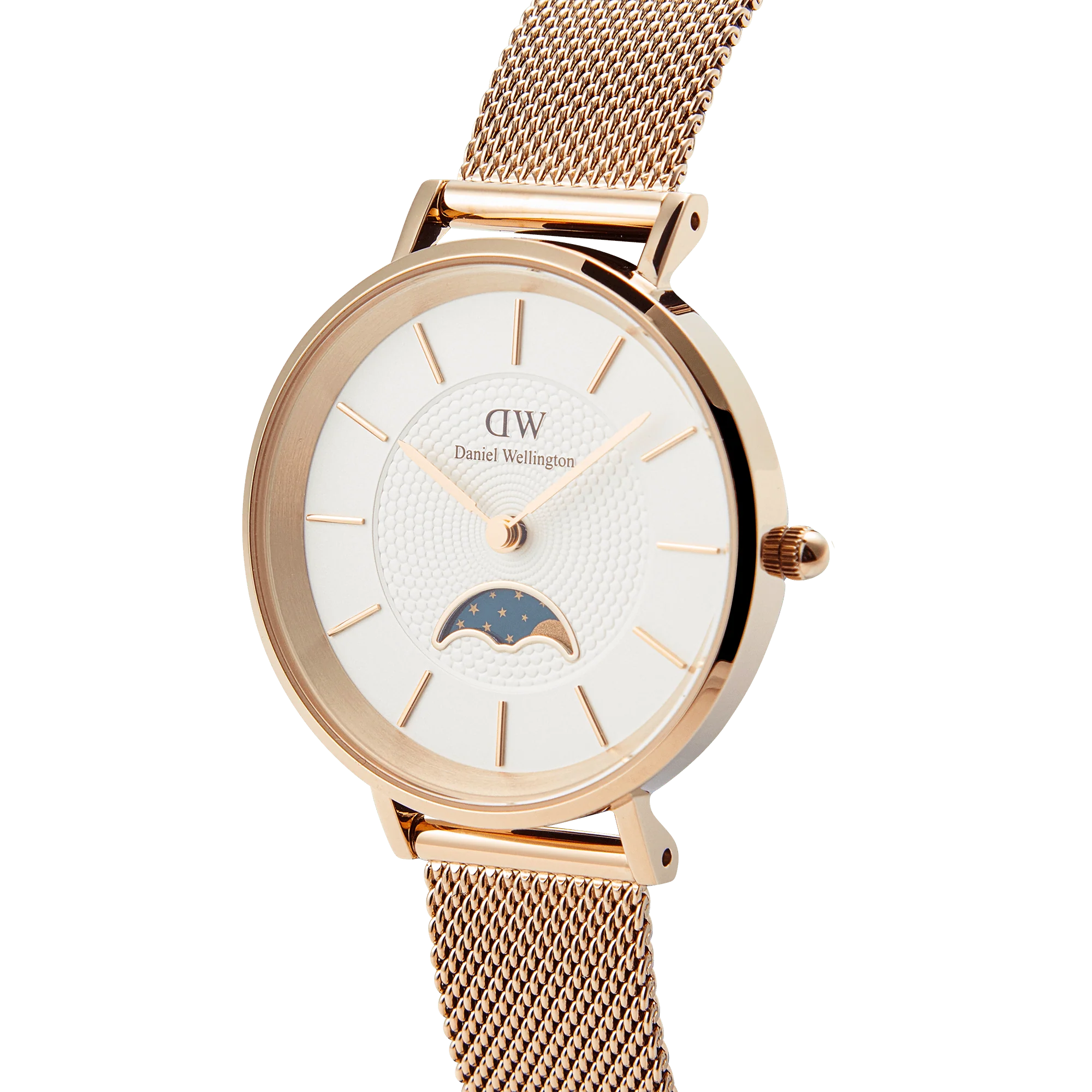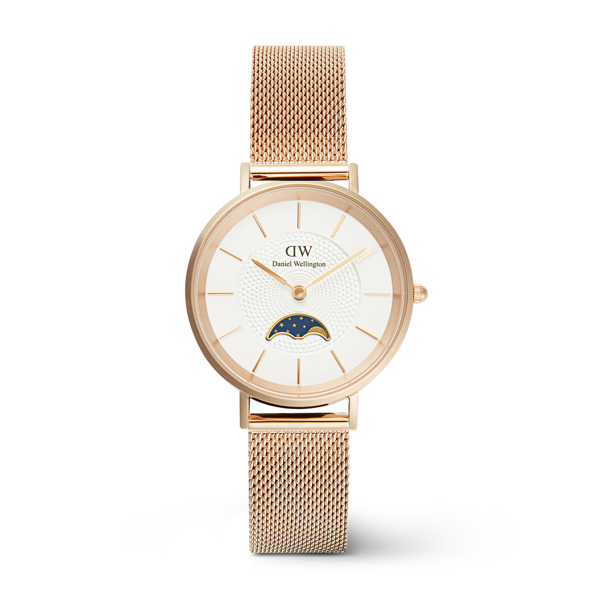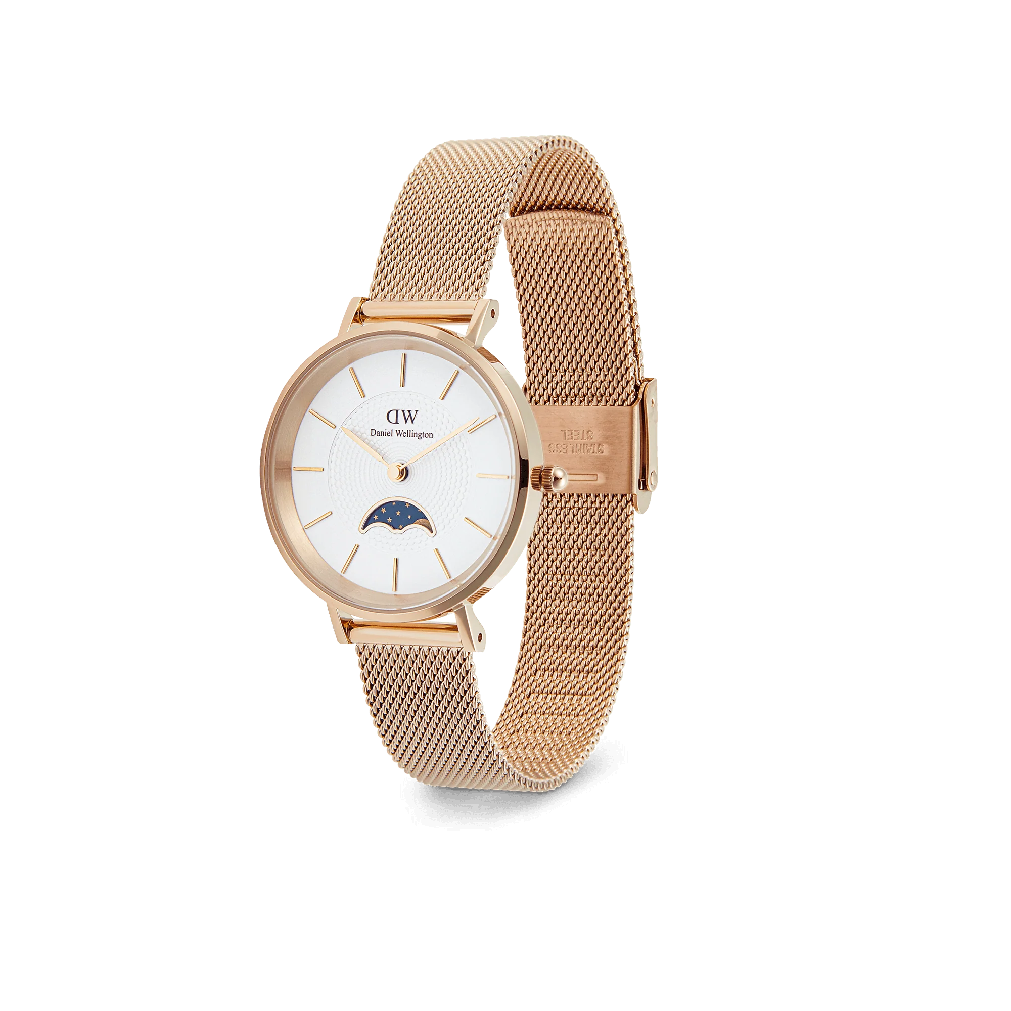 Rimani in sintonia con i cicli lunari. Petite Lune presenta un esclusivo quadrante secondario con le fasi lunari, che tiene traccia di dove ci troviamo nel mese, passando dalla luna nuova alla luna piena e viceversa. Il cinturino in maglia milanese oro rosa è intercambiabile, così da poterlo abbinare al tuo stile di giorno o di notte, sotto il sole o sotto le stelle.