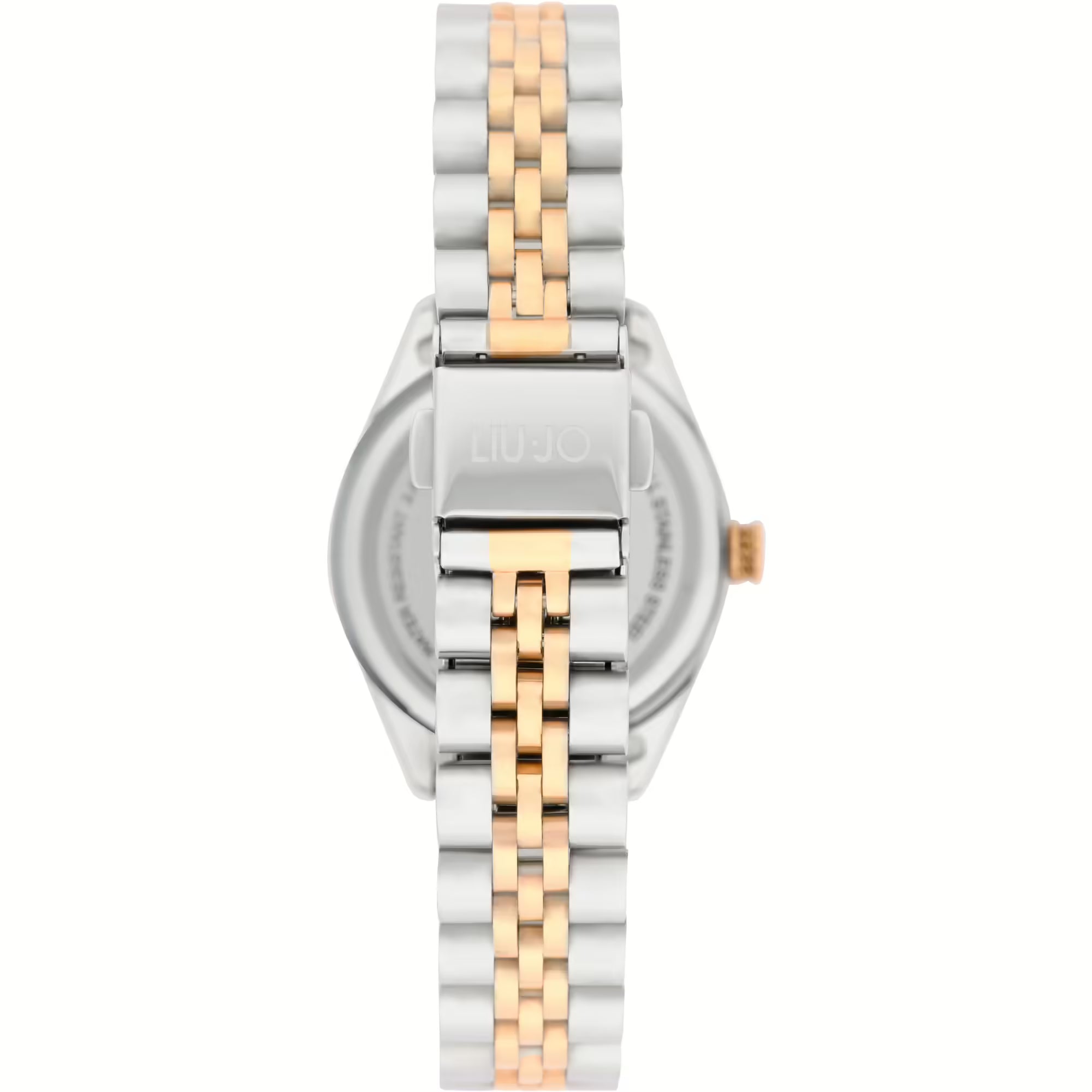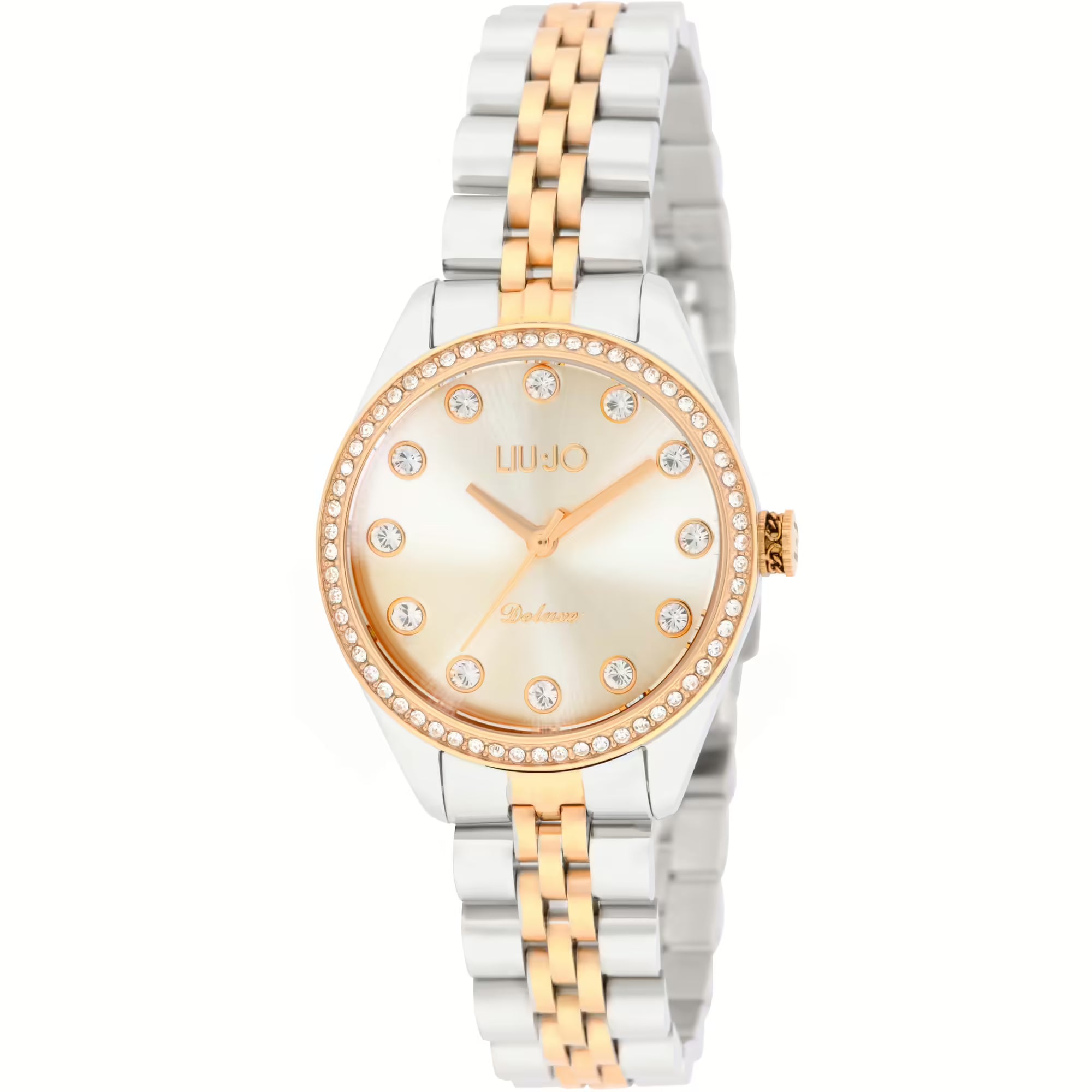 Orologio da donna di LiuJo della collezione Deluxe. Orologio 3 hands con movimento Miyota Cal. VJ21. La cassa è in acciaio di colore Bicolor argento/oro rosa dal diametro 30 mm. Il vetro è menerale. Il colore del quadrante è argento con sulla lunetta e sugli indici. Il cinturino è in acciaiodi colore Bicolor argento/oro rosa. La resistenza all'acqua è di 5 ATM. La referenza è TLJ2428