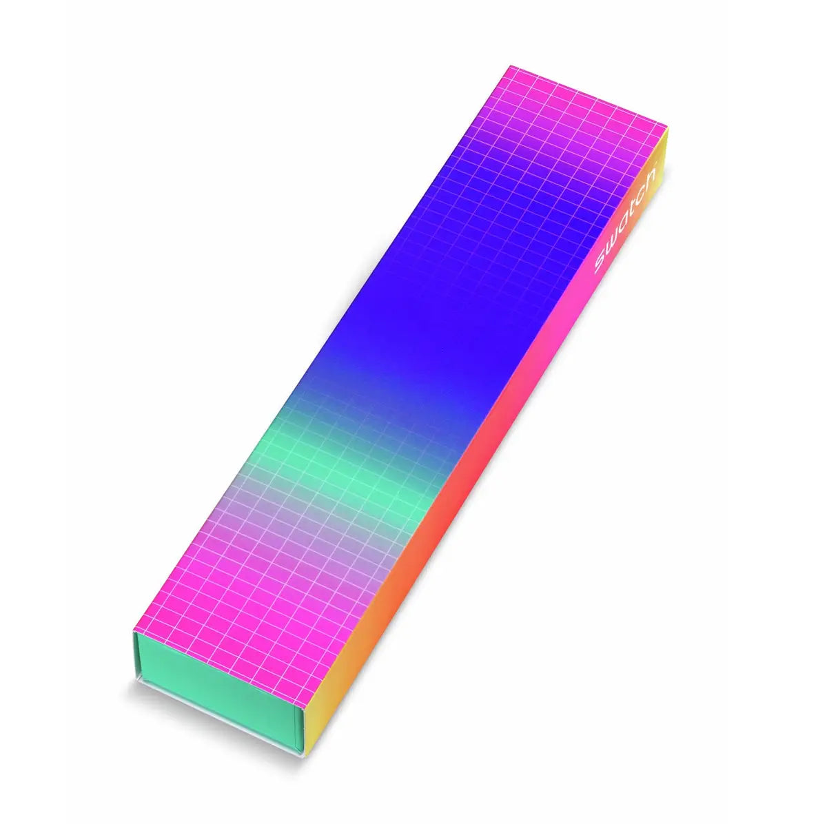 Questo cronografo dai colori neon si ispira a uno Swatch CHRONO degli anni '90, il FLASH ARROW (SCL100). Il quadrante multicolore con scala tachimetrica è dotato di lancette nere fosforescenti per le ore e i minuti, di una lancetta gialla per i secondi e di una finestra per il giorno a ore 3. La cassa è di colore verde opaco trasparente con lunetta in tinta. Il cinturino rosa strutturato è arricchito da passanti trasparenti opachi gialli e blu a contrasto e da una fibbia verde opaca trasparente.